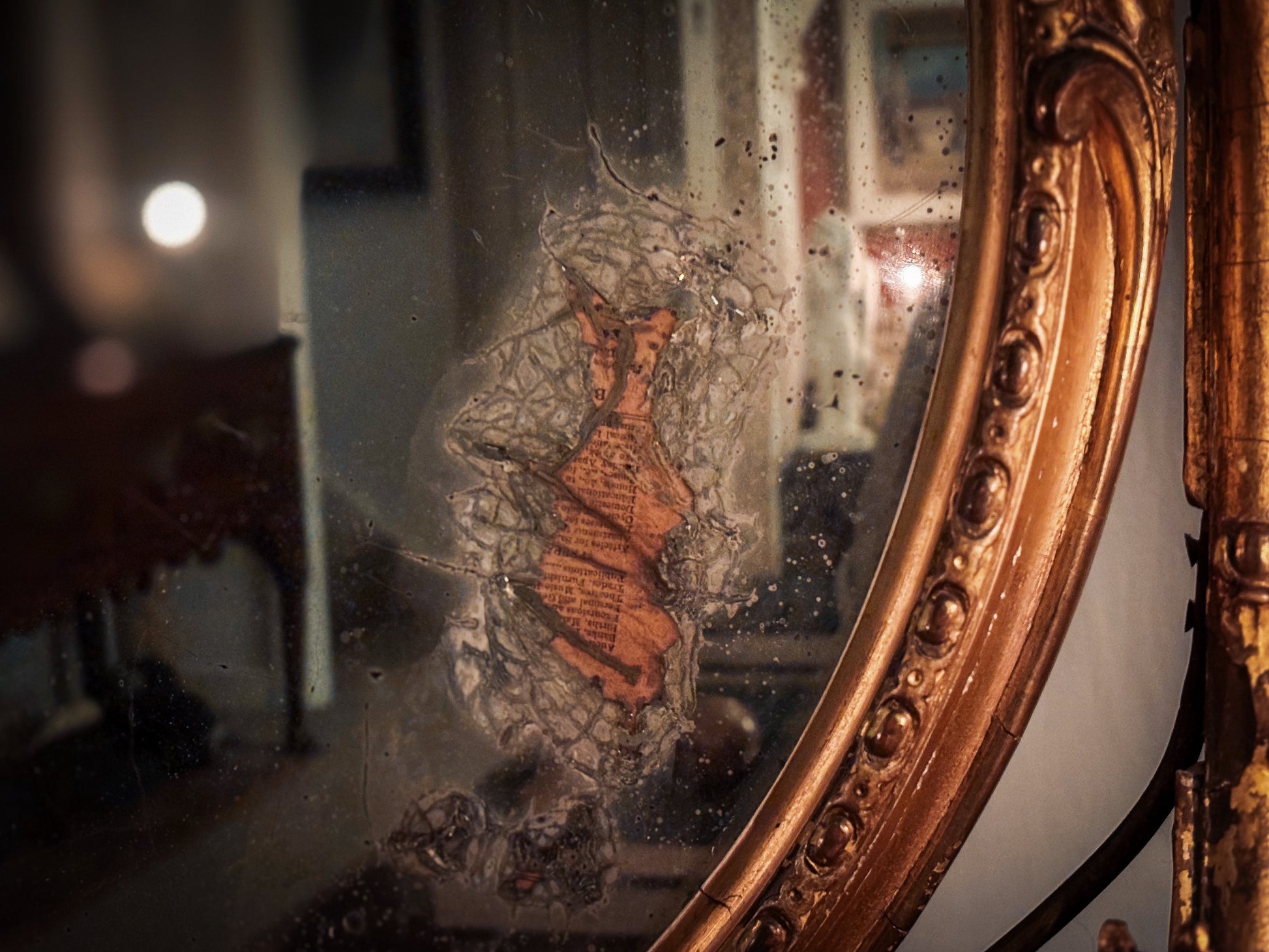 Historical wear and losses to the gilding and gesso consistent with age. The feet and lower supports show old structural repairs secured with metal strengthening plates (Victorian and later), now stable and serviceable. Brass candle arms original with untouched patina. Mercury plate original and unrestored. No later replacements detected.