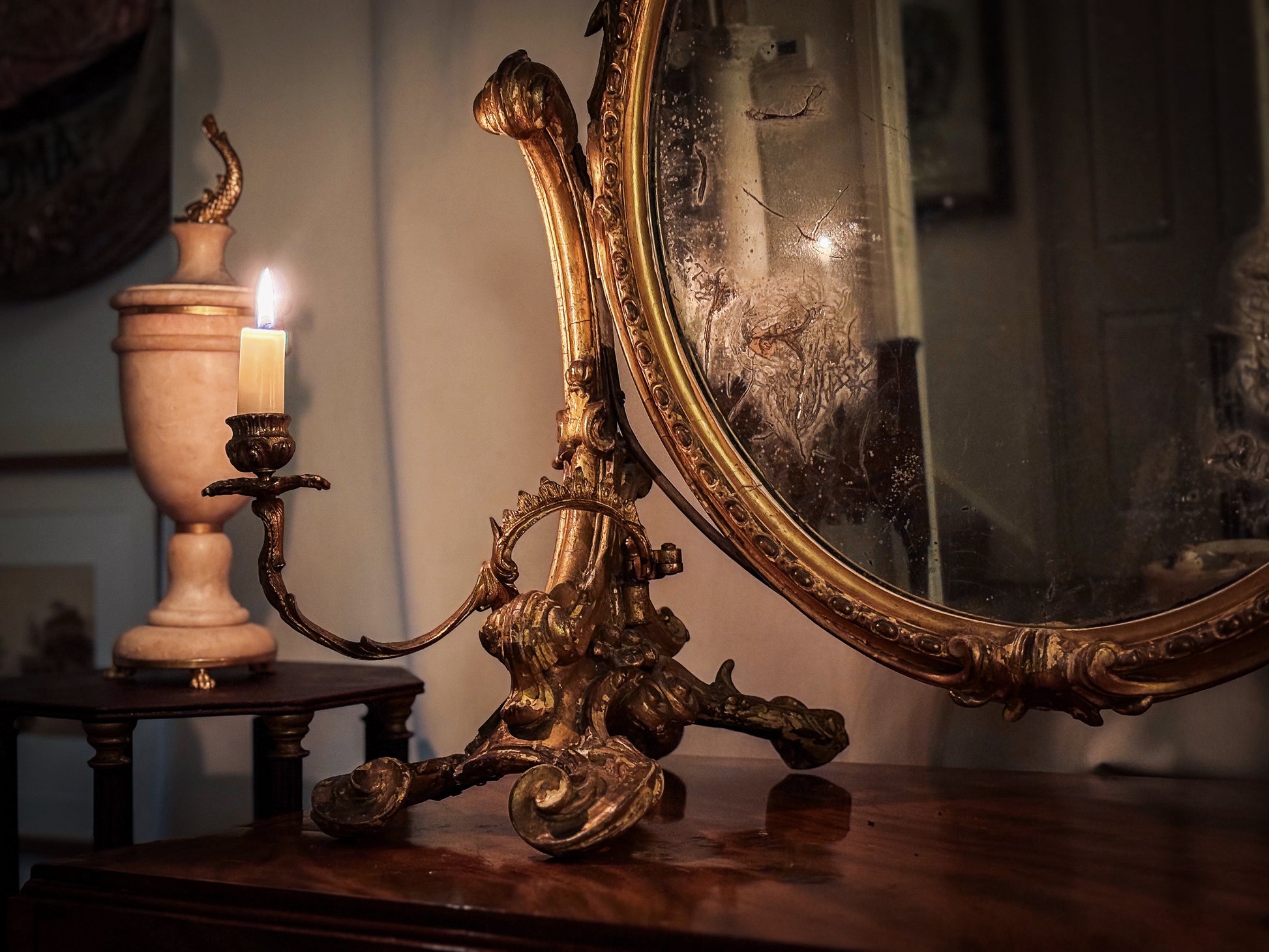The mirror plate is original and features the characteristic deterioration of mercury silvering, with areas of foxing, crystallisation and silver loss revealing sections of the period paper backing. The original blue linen gasket is still visible between the plate and the rebate. Surviving table-form girandoles of this type are exceptionally scarce, most 19th-century girandoles having been produced as wall mirrors; this hybrid form reflects the specialist work of mid-century London and provincial gilding shops, often incorporating Continental (particularly Florentine) carving influences.
