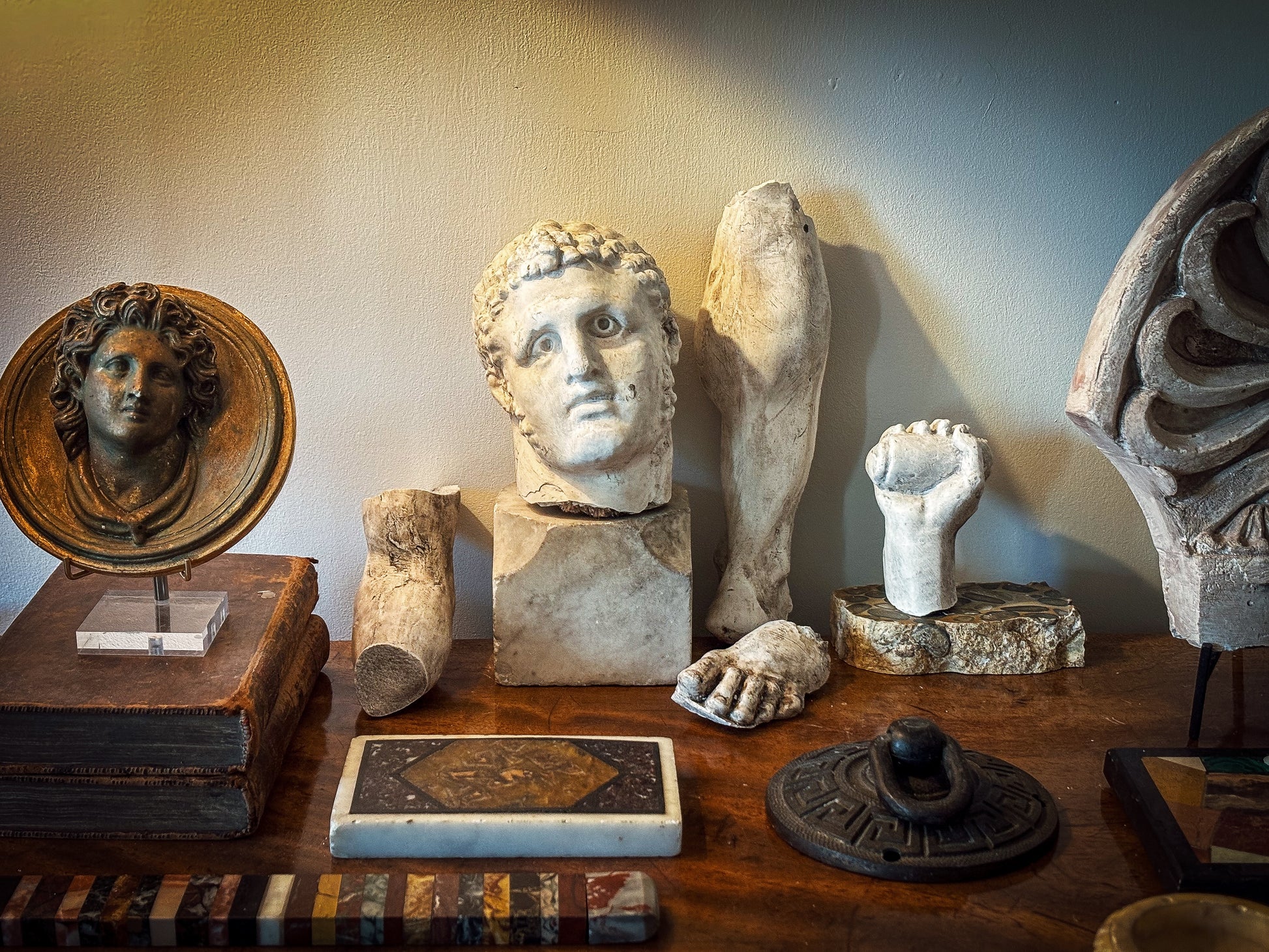 A striking group of sculptural fragments taken from the celebrated Capitoline Hercules, comprising a hand, foot, head, leg and bicep, each cast in plaster and arranged as a cohesive study of the classical male form.