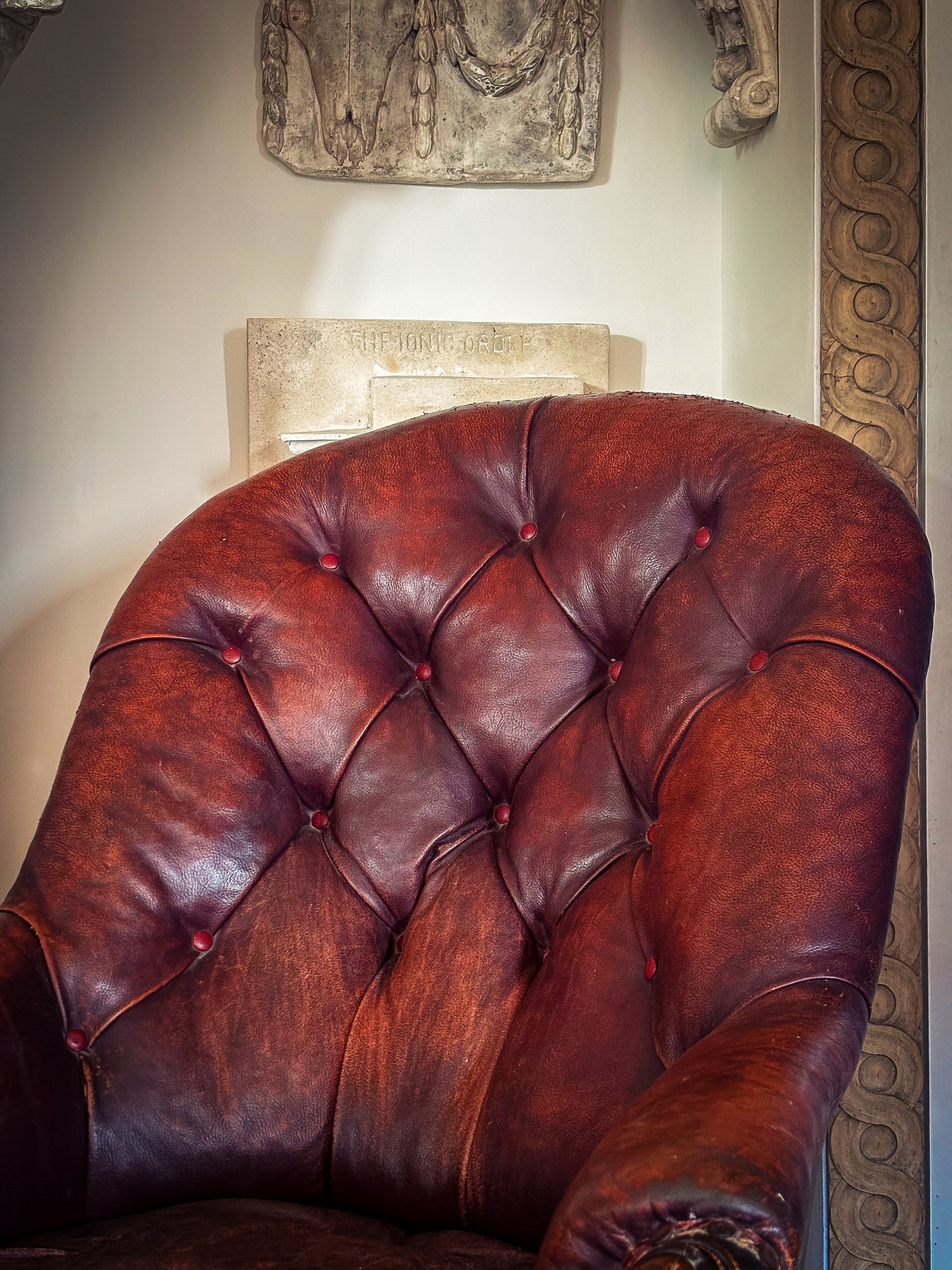 The leather upholstery is original or early and has worn beautifully over time to a rich oxblood tone, with exceptional depth and variation in colour. The surface displays natural creasing, crackle and areas of wear, particularly across the seat, creating the sort of authentic patina so sought after in English country house interiors.