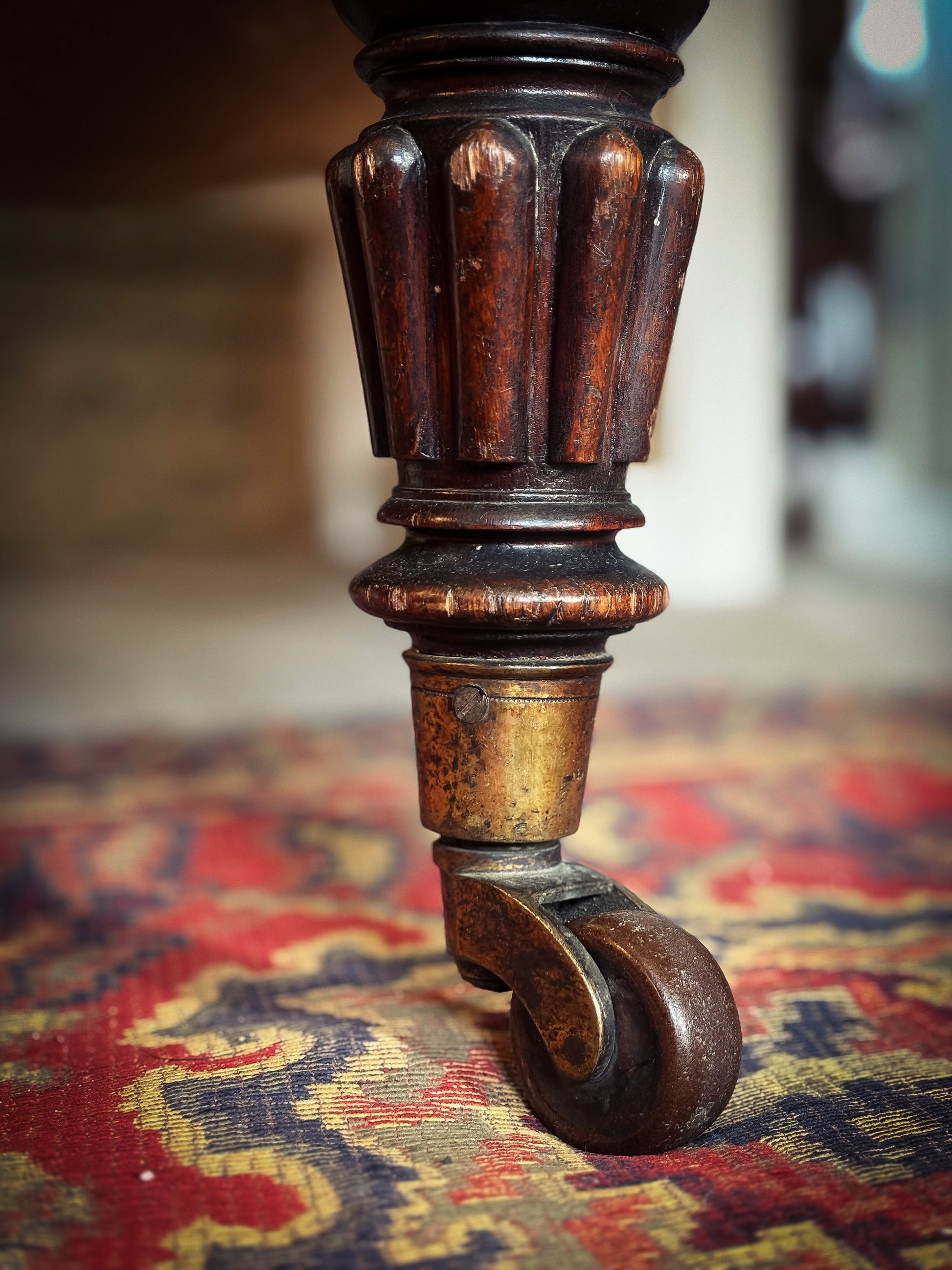 A superb William IV period English leather library armchair, of generous proportions and excellent country house form, raised on turned and fluted front legs terminating in original brass caps and castors.