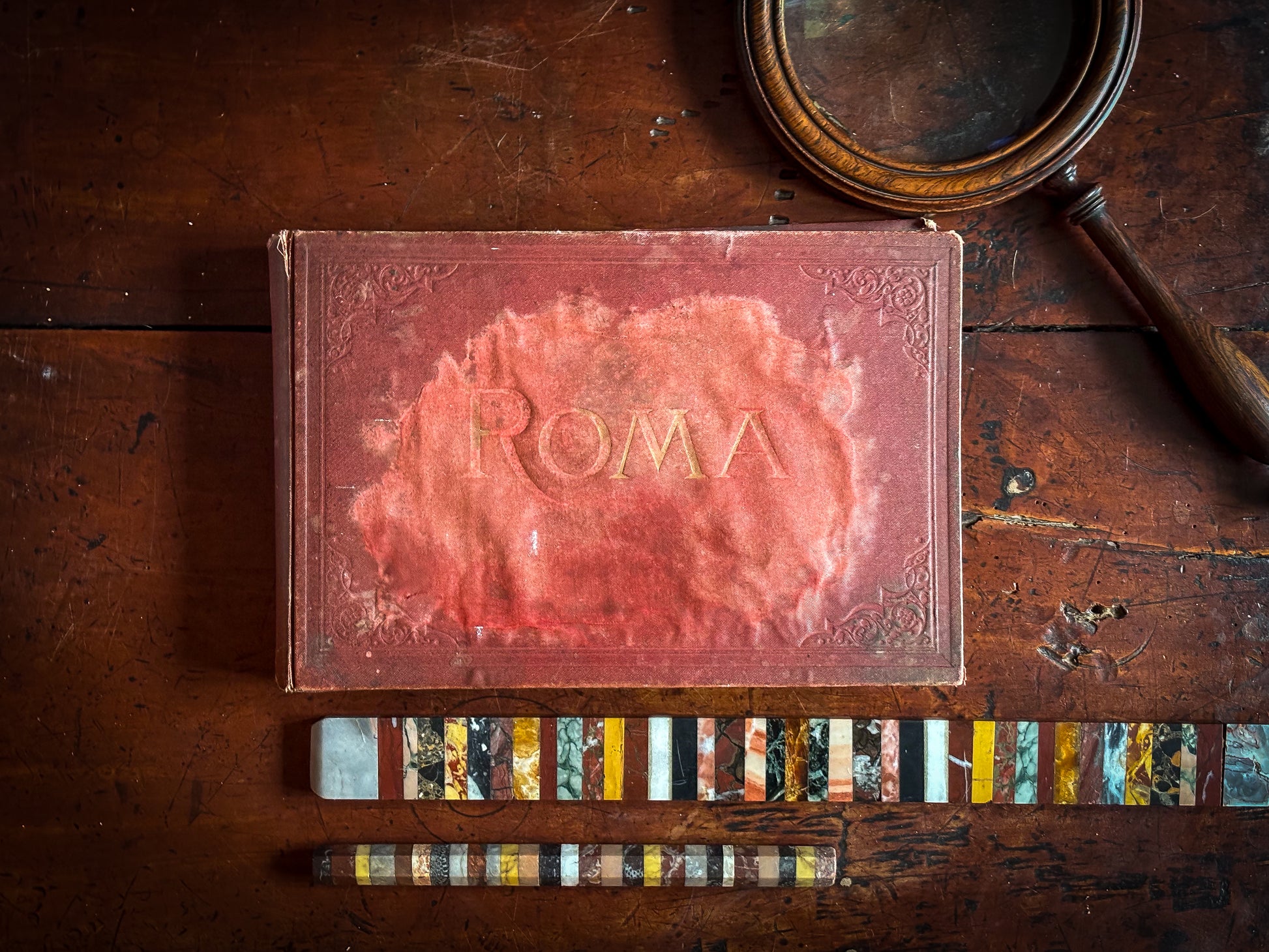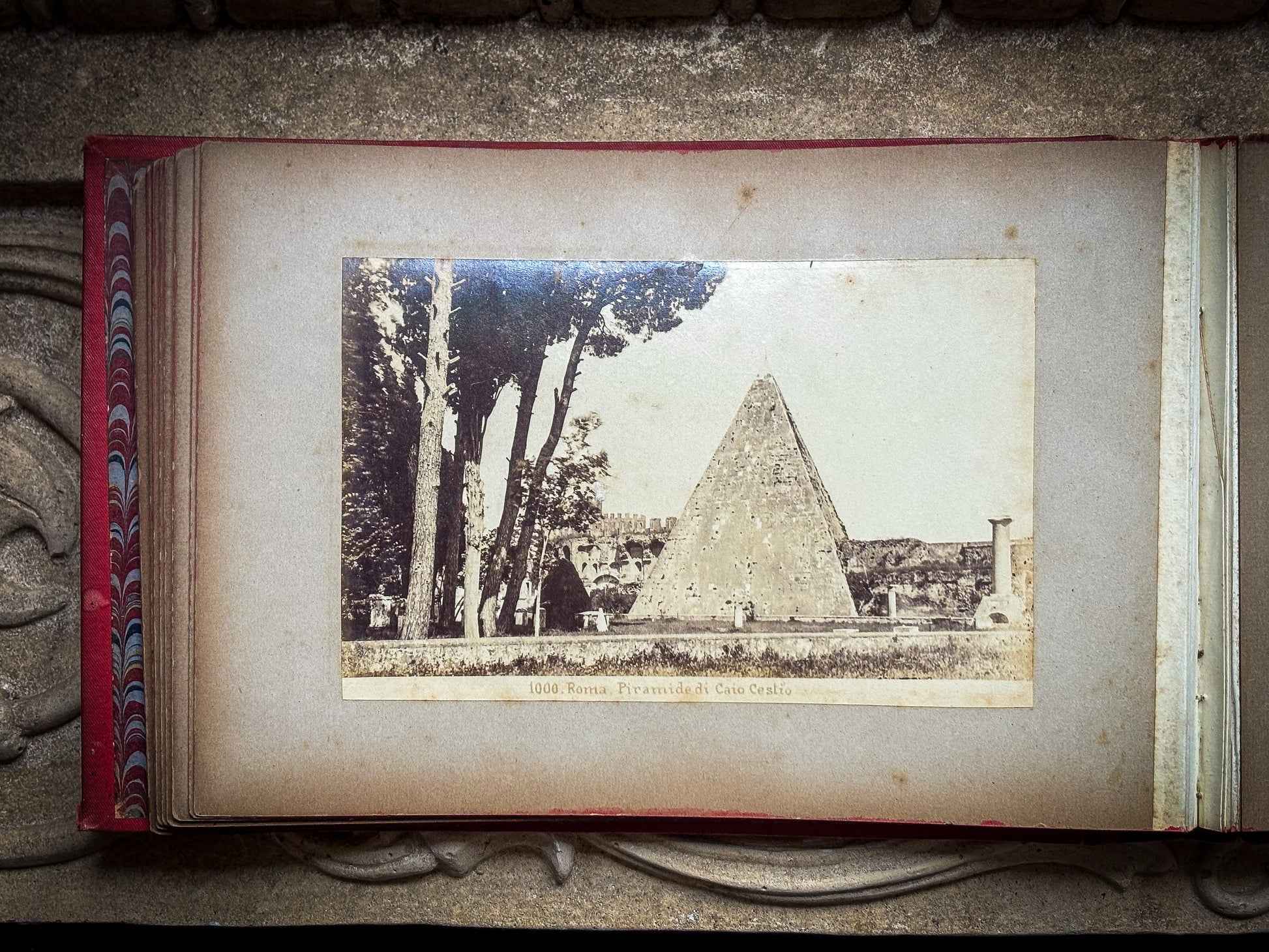 A handsome 19th-century Roman souvenir album containing a series of early albumen photographs depicting the principal monuments of ancient and classical Rome. Bound in its original red cloth boards titled “ROMA” in gilt, the album comprises a sequence of mounted photographs printed in warm sepia tones and captioned in Italian with numbered series titles typical of the commercial photographic studios active in Rome during the later 19th century.