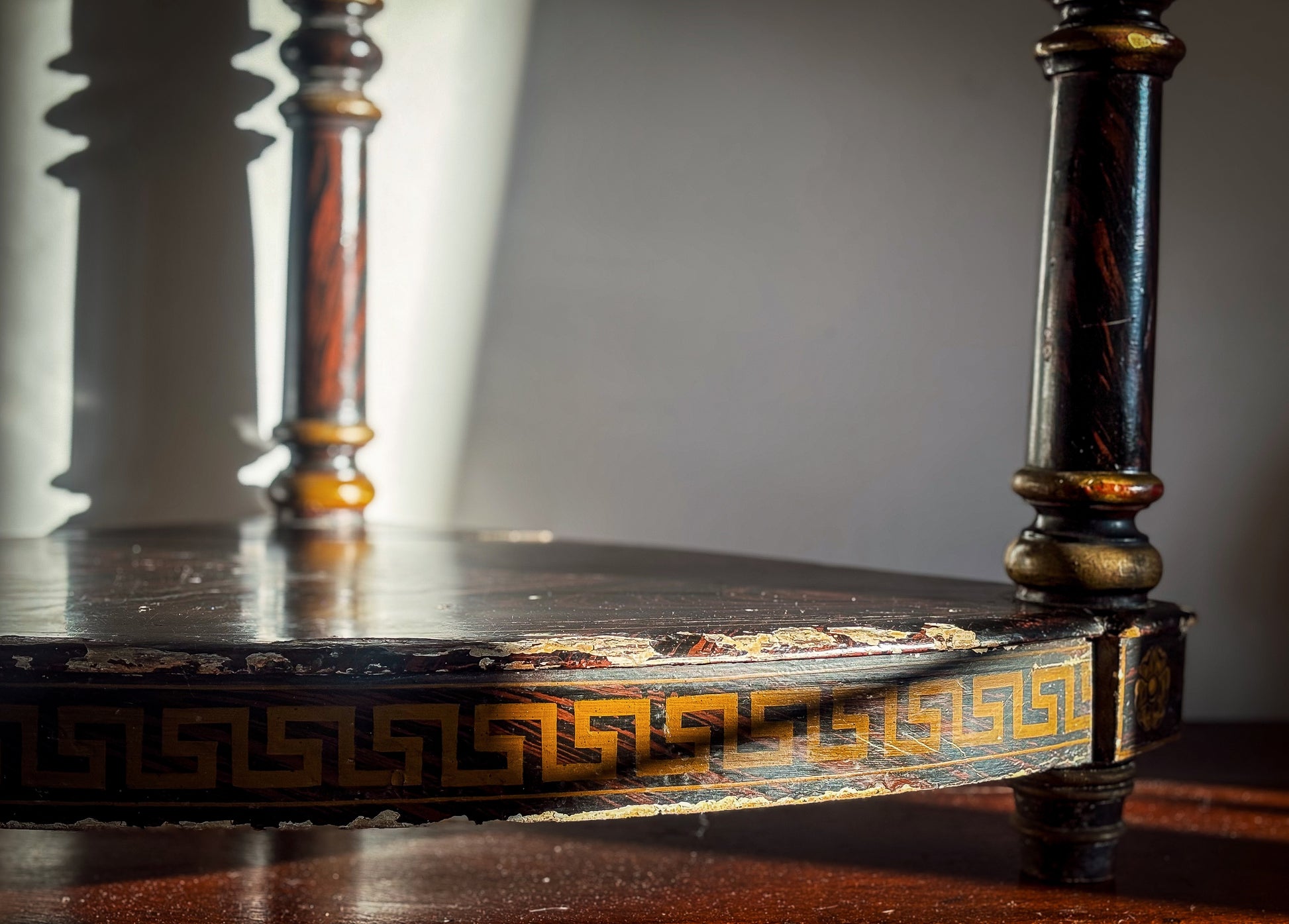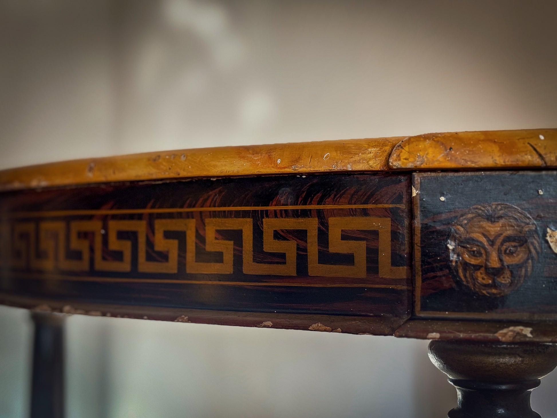 The frieze is centred at the upper angles with stylised classical lion masks, and the table is raised on three turned and ringed supports. The frieze, supports, sides, back, and conforming undertier are entirely faux-grained in imitation of coromandel wood, the undertier centred at the angles with painted classical rosettes.