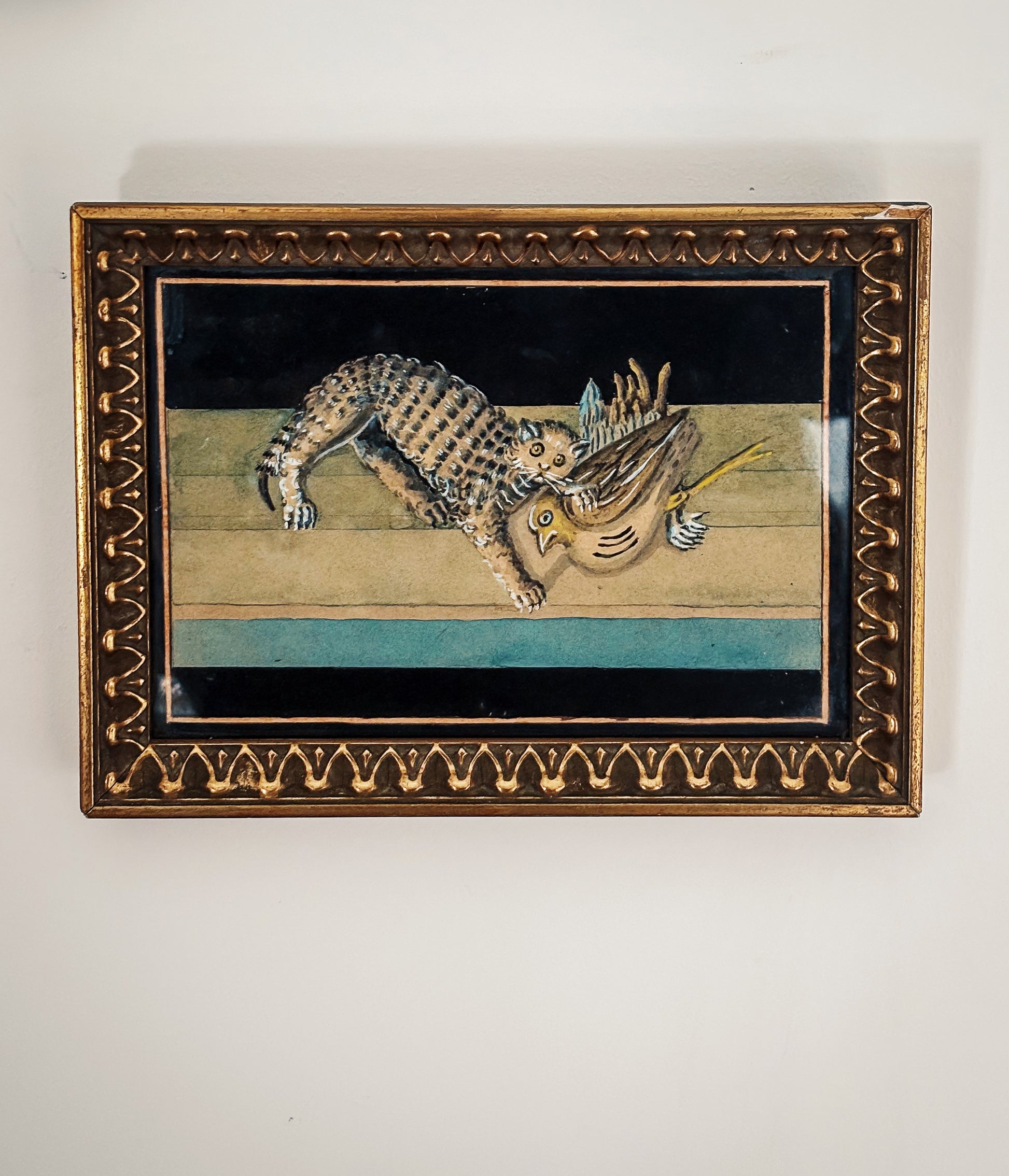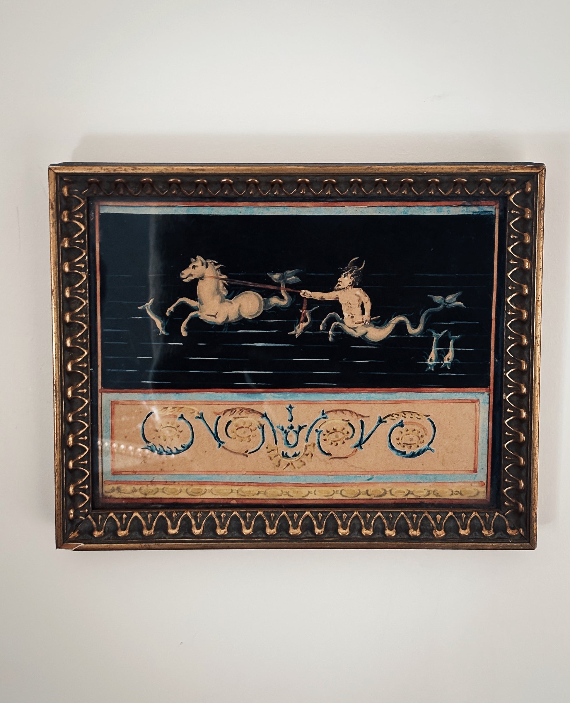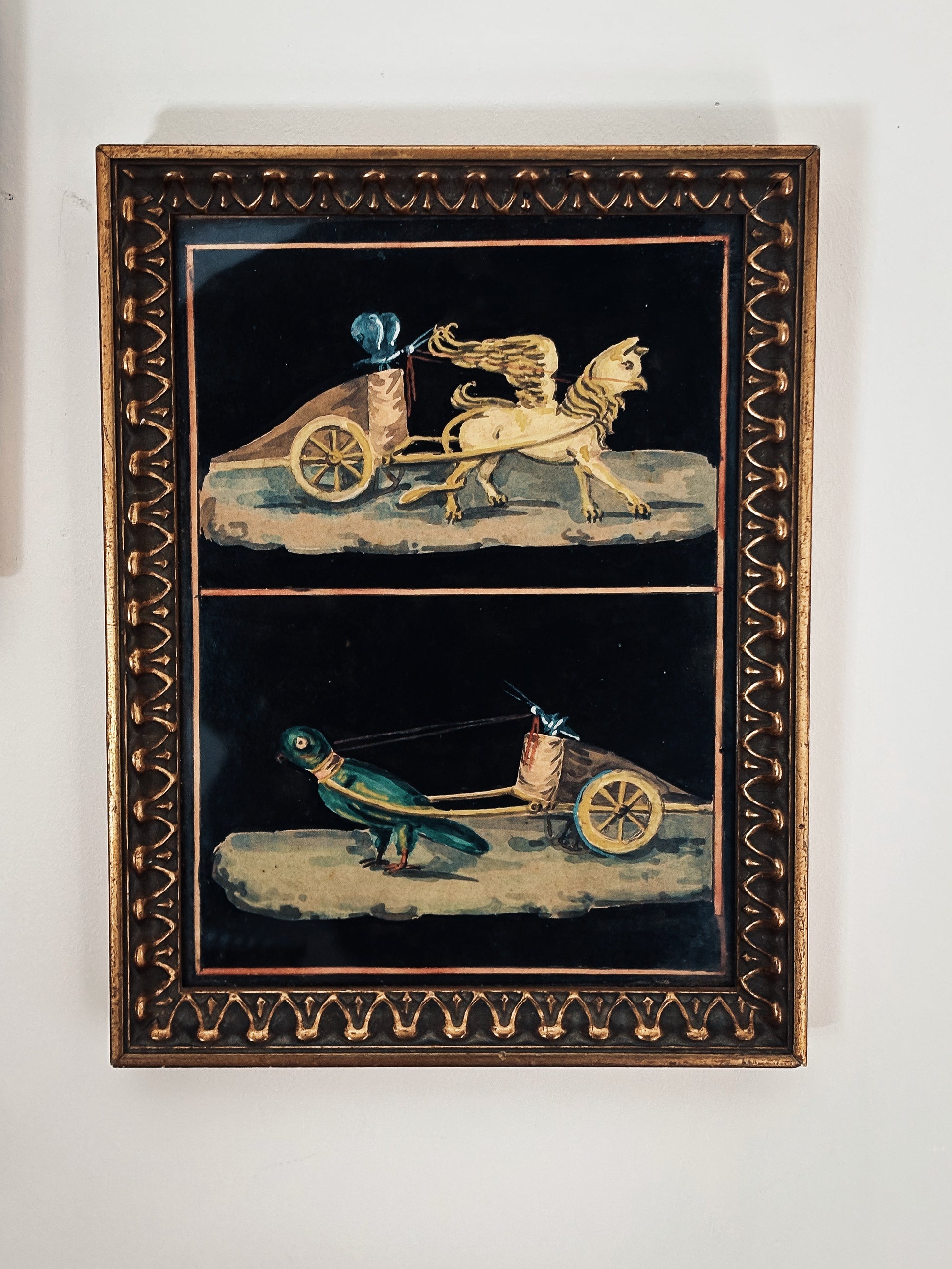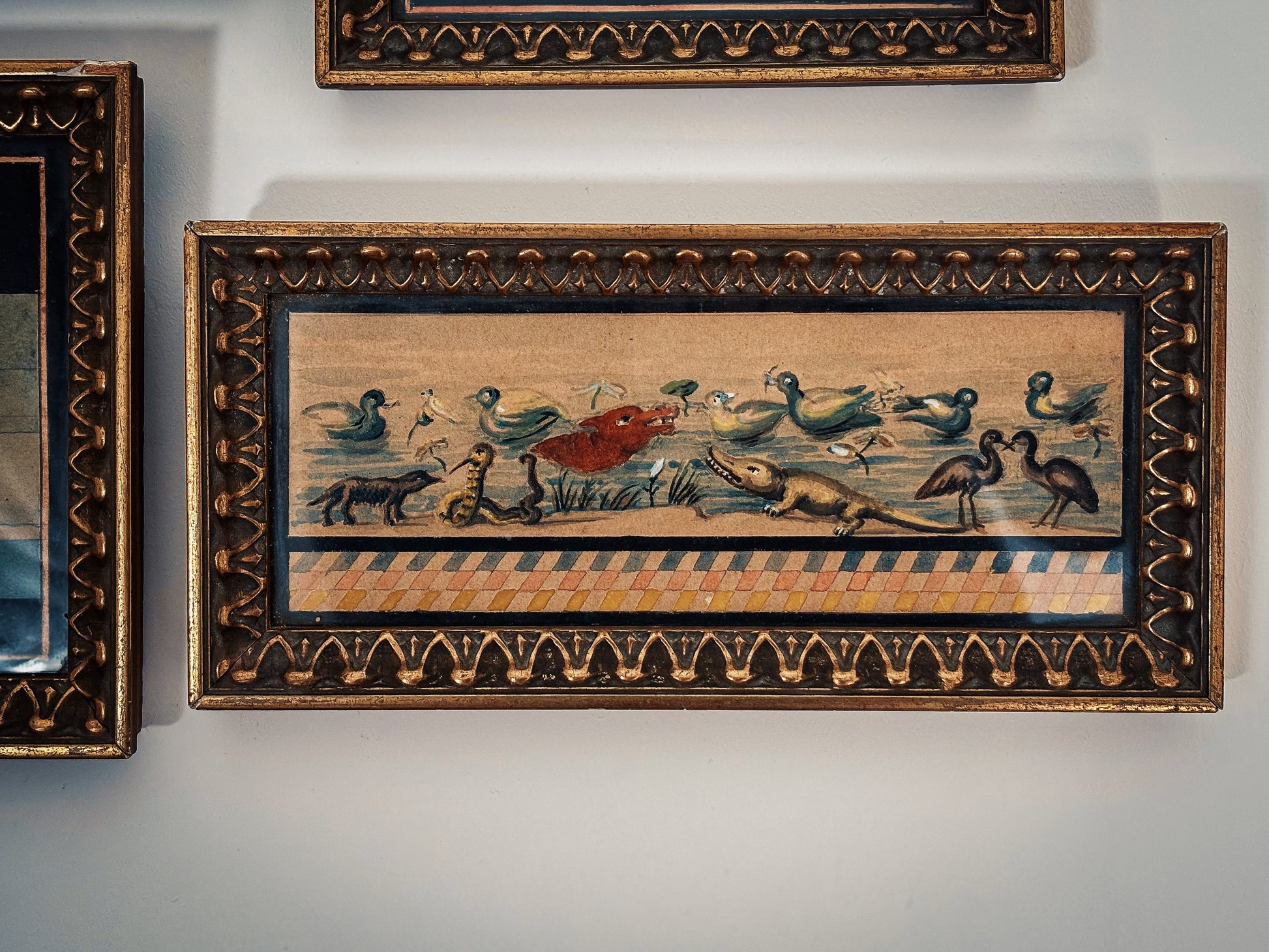 A playful set of Grand Tour souvenirs, these watercolours are directly inspired by the mosaics and frescoes excavated at Pompeii in the 18th and 19th centuries. Subjects include the cat and quail from the House of the Faun, Nilotic scenes of crocodiles and ibis, a triton with hippocamps, and butterfly and cricket charioteers. Together they capture both the erudition and the humour of Roman art, qualities that delighted 19th-century travellers just as much as they do today.