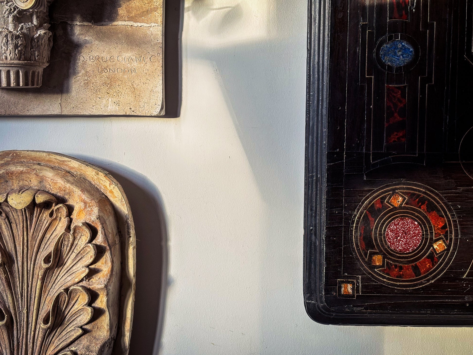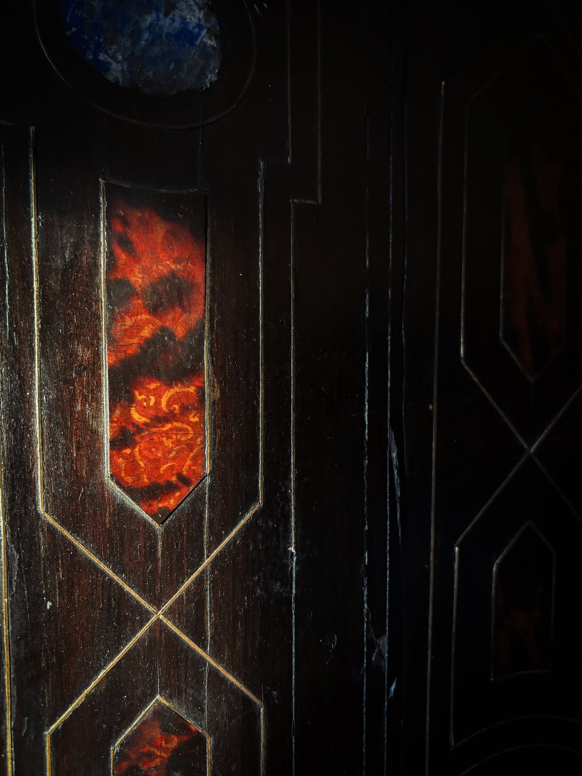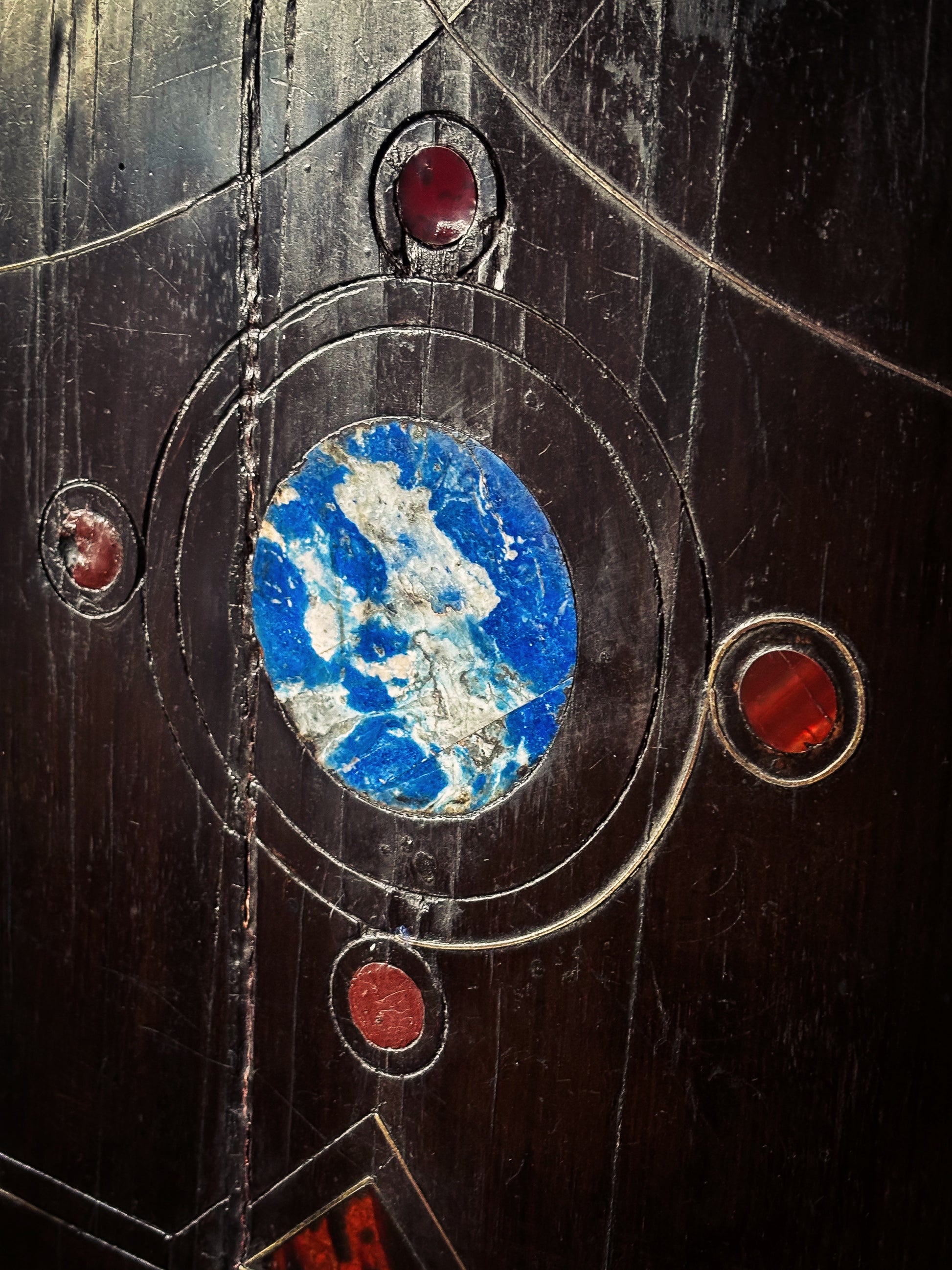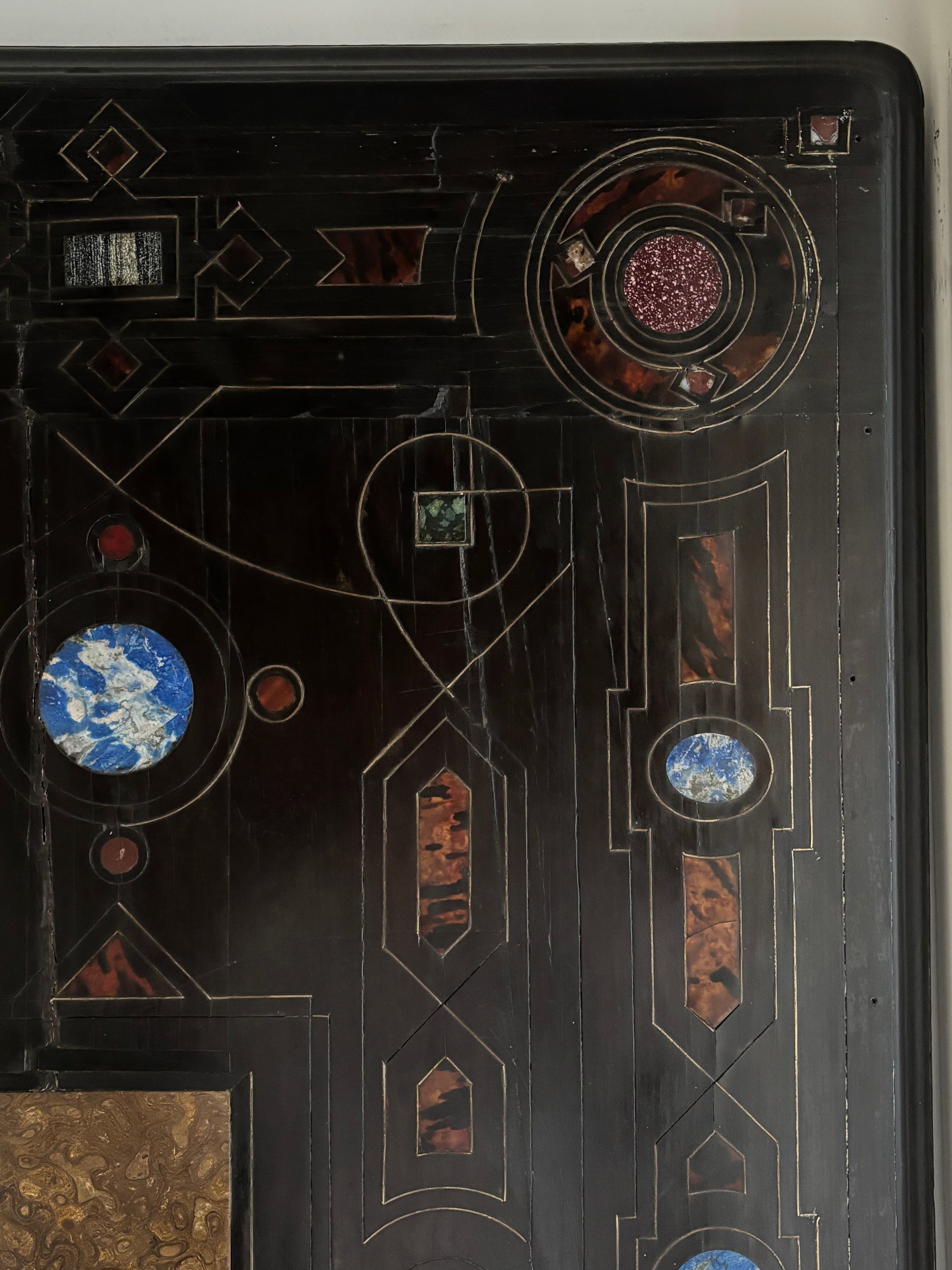 Richly inlaid with precious hardstones set within ebony veneer and brass stringing and enclosed by extensive tortoiseshell inlay. The scheme incorporates imperial porphyry roundels, lapis lazuli ovals, green porphyry, Sicilian jasper in warm giallo tones, carnelian, and a variety of Mediterranean breccias and jaspers.