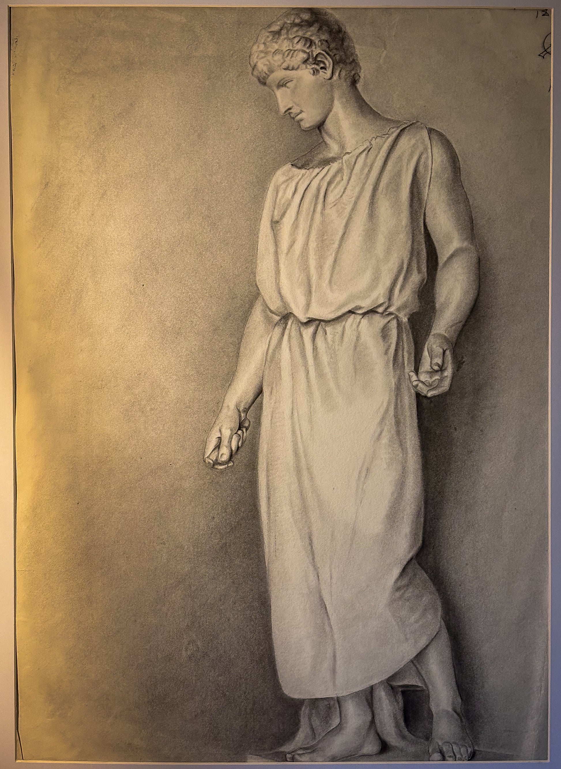 This large, meticulously finished sheet is an examination drawing made under the South Kensington system at the National Art Training School on the site of today’s Victoria and Albert Museum and Royal College of Art. Worked in charcoal and graphite over a finely prepared surface, it records a full-length plaster cast of the Capitoline Antinous, here in the prudently draped variant supplied to Victorian art schools. The idealised head with its heavy curls, the downward, introspective tilt of the face and the delicately balanced contrapposto all follow the celebrated Roman marble, while the high-girdled tunic and bare right arm translate the ancient nude into something acceptable to late-19th-century pedagogical taste.