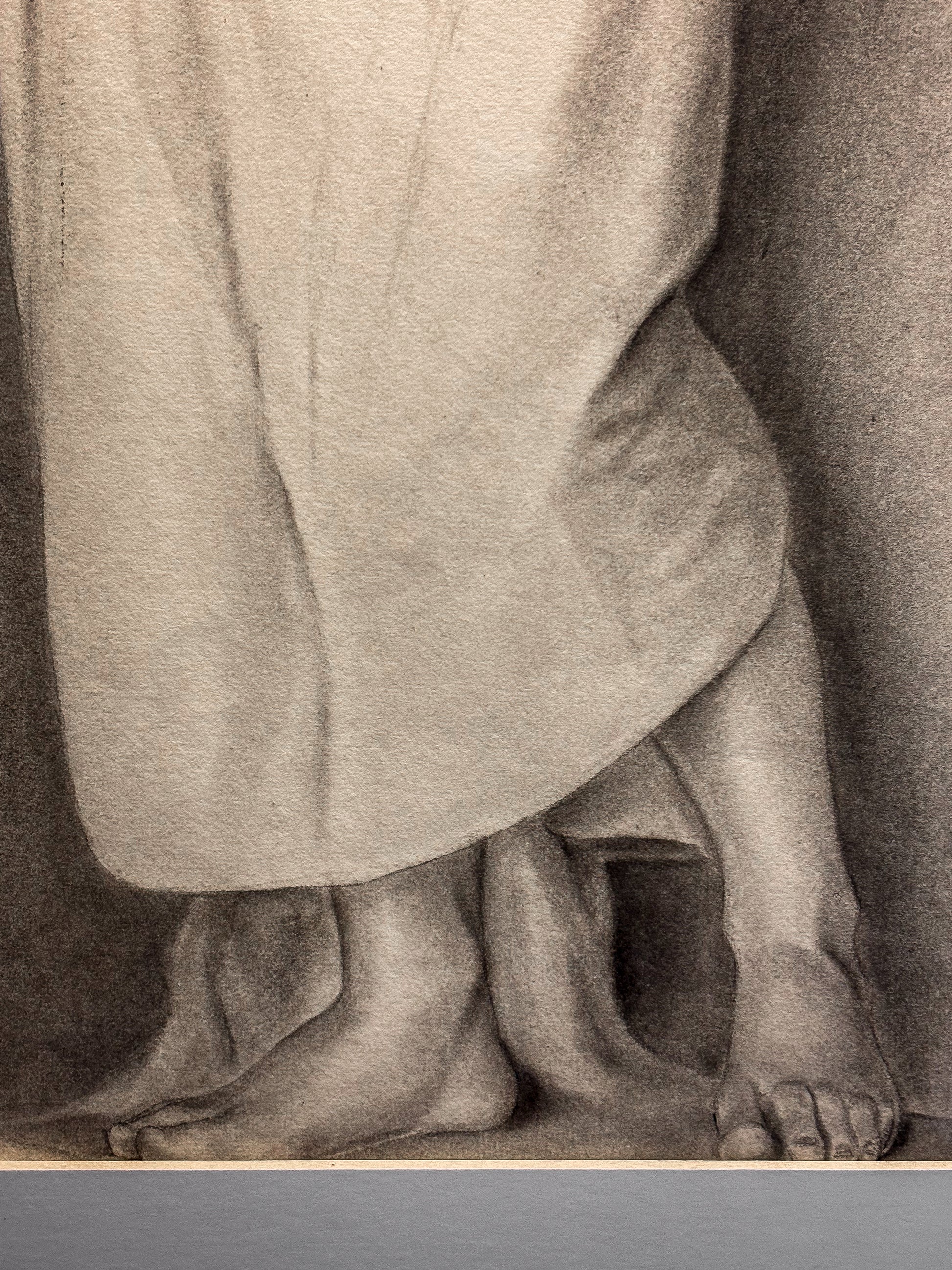 The draughtswoman pursues an almost sculptural understanding of form. The modelling of the head and neck, the fall of folds across the chest and cinched waist, and the carefully weighted feet on the plinth are rendered through slow, disciplined gradations of tone rather than outline, in strict accordance with South Kensington teaching. Light gathers at the brow, collarbone and knuckles before dissolving into the soft penumbra of the background. Hands and feet – traditional tests of skill – are observed with particular care, the toes articulated one by one and the tension of the fingers registered against the stillness of the pose.