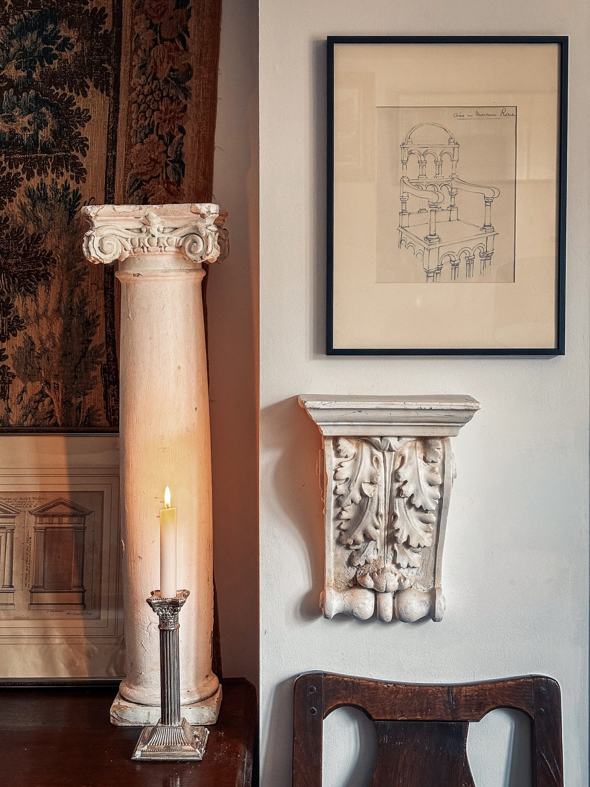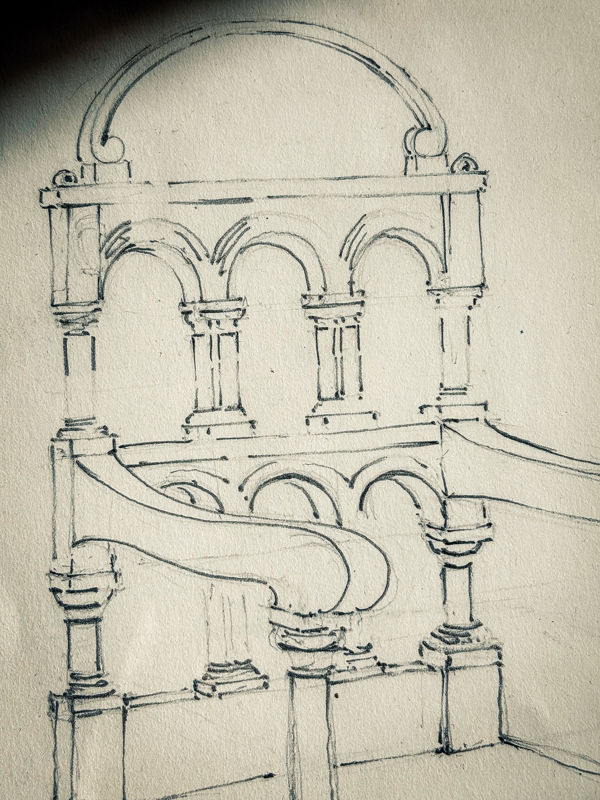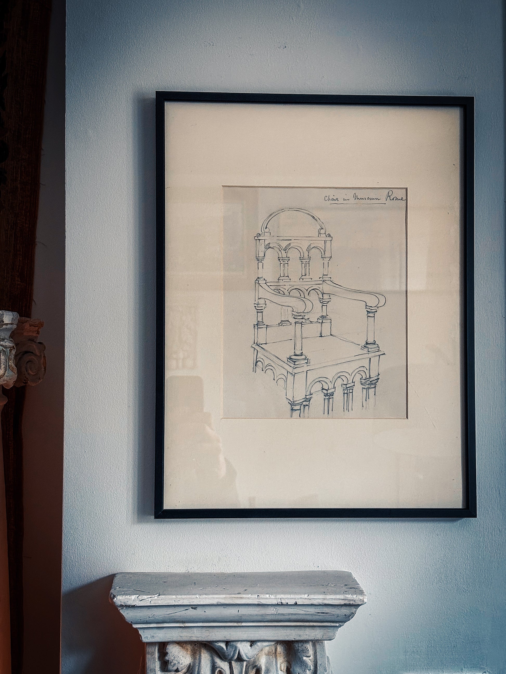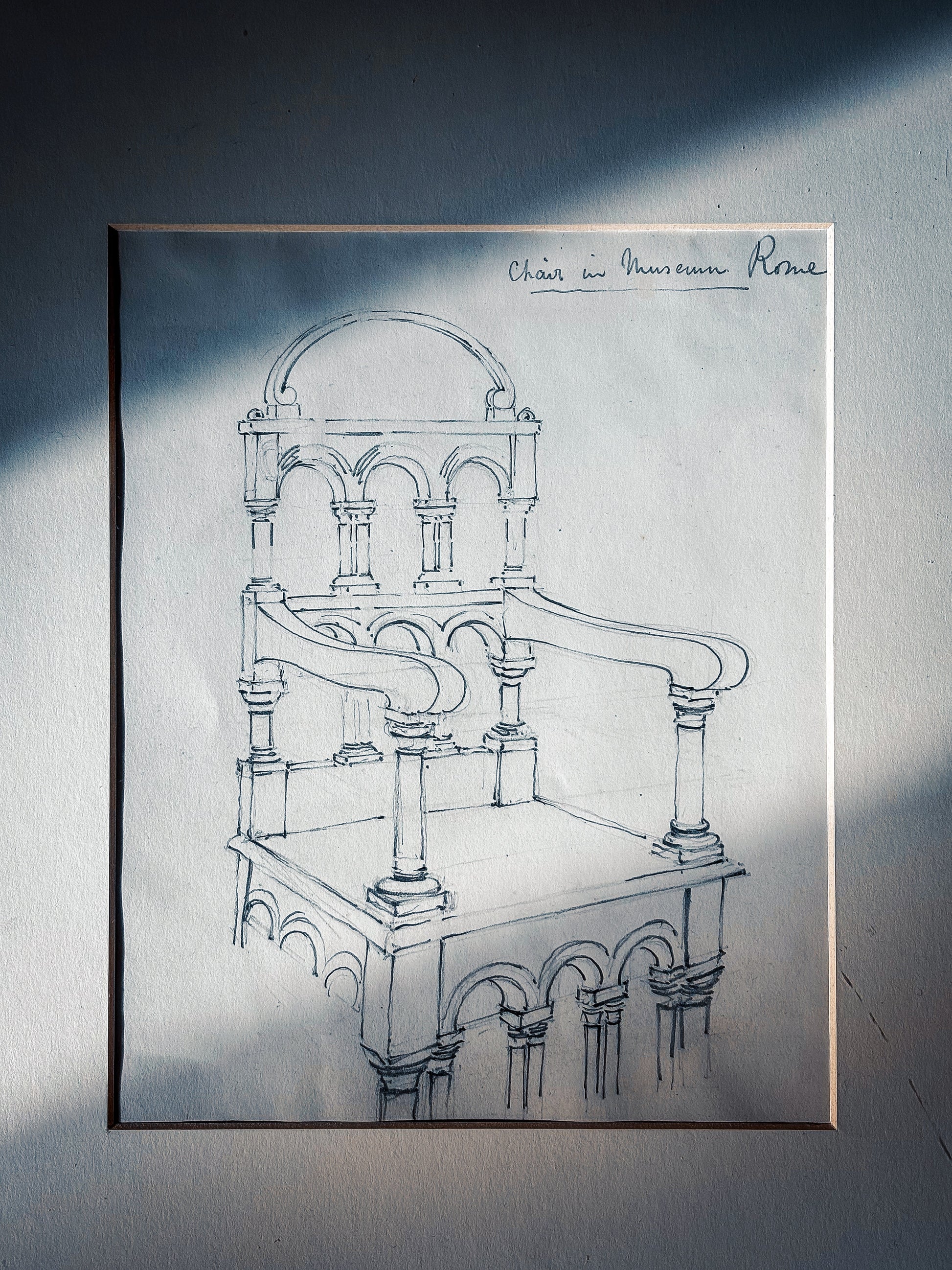 An architect’s eye on an English icon encountered abroad. Leach records the celebrated “Drake’s Chair” , the Bodleian Library’s 17th-century armchair made from the timbers of the Golden Hind distilling its structure into pure architecture: triple arcades, paired colonnettes and a shallow domed crest. The inscription “Chair in Museum, Rome” suggests he studied a reproduction or display in Rome, a reminder of how Victorian design education circulated historic models internationally. A compelling Grand-Tour-meets-Elizabethan curiosity that sits beautifully with casts and models.