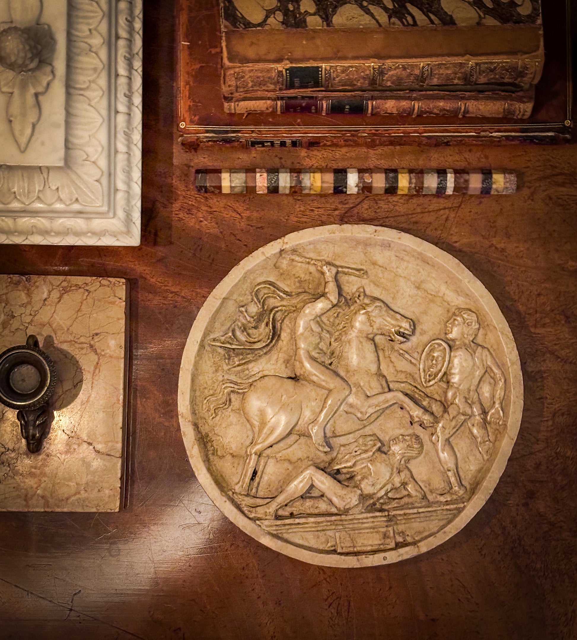 In high relief, a nude warrior on a rearing horse twists sharply in contrapposto as he raises a club to strike, his short cloak and hair streaming behind him. Beneath the horse’s forelegs a fallen adversary lies crushed, his small shield adorned with a mask; at the right a second soldier advances with spear and oval shield, its boss carved as a gorgoneion. The compressed bodies, tense musculature and agitated drapery closely follow Cairano’s original composition, distilling one of the key images of Lombard Renaissance sculpture into an intimate, wall-hung roundel.