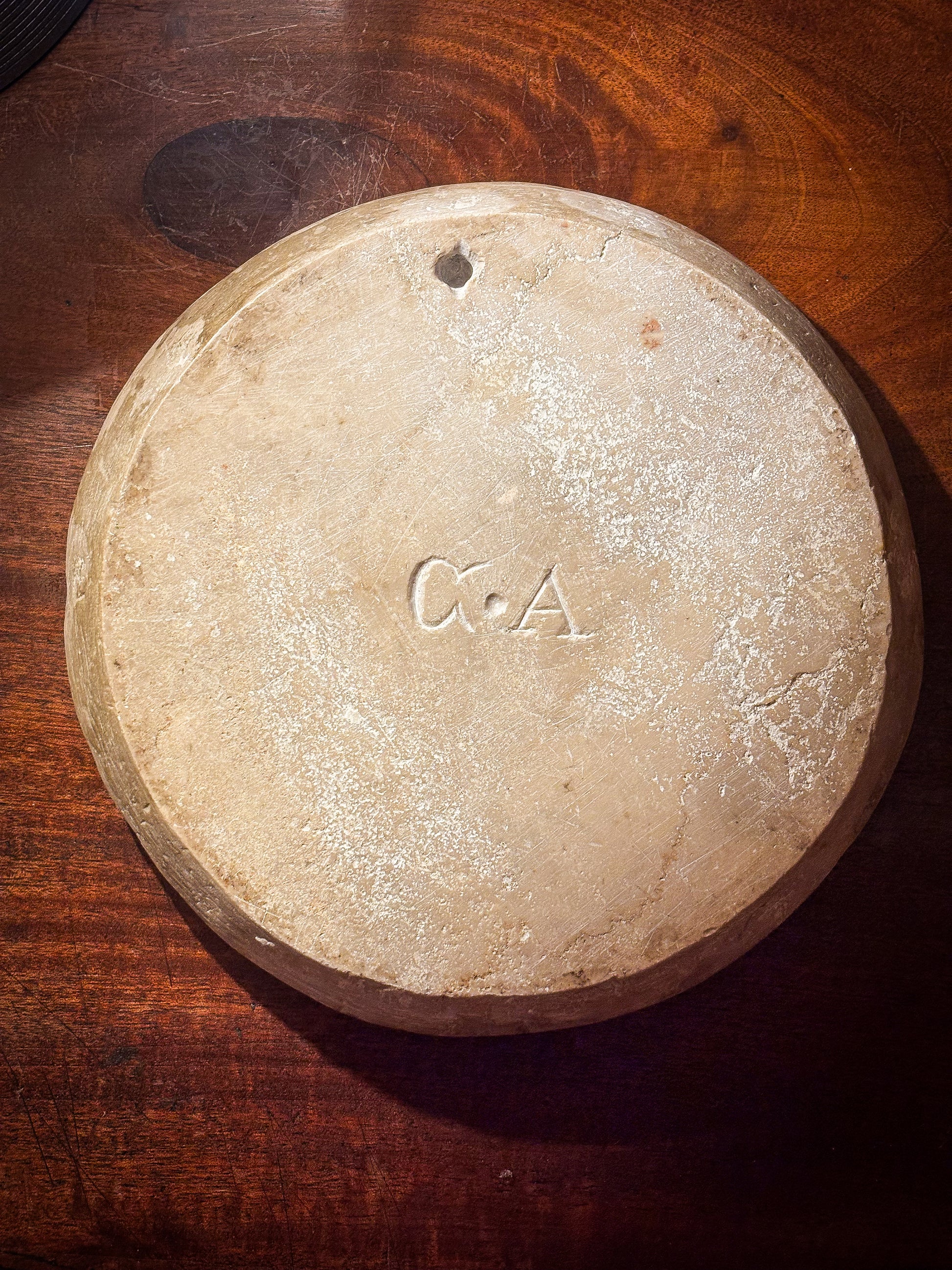 The tondo is worked in luminous Carrara statuario marble, with crisp undercutting and a sensitively polished surface that catches the light beautifully. The reverse is neatly incised with the monogram “C.A.”, very likely recording the sculptor or atelier. The quality of the carving, the scholarly source and the choice of fine statuario place the piece firmly within the Roman Grand Tour tradition fostered by workshops such as those of Cavaceppi and Carlo and Filippo Albacini, even if a more precise attribution remains to be established.
