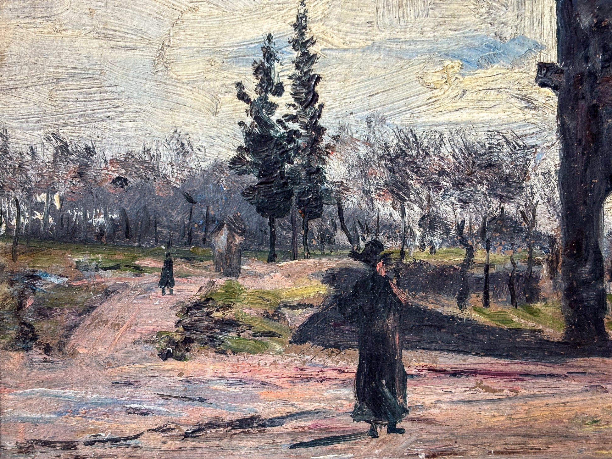 A finely observed late 19th-century oil sketch depicting the Arch of Constantine in Rome, painted in 1876. The great triumphal arch rises in dark silhouette against a luminous sky, while a solitary cloaked figure crosses the dusty road in the foreground and the slopes of the Palatine Hill ascend beyond. To the right of the arch the artist has also captured the remains of the Meta Sudans, the monumental Roman fountain that once stood beside the Colosseum.