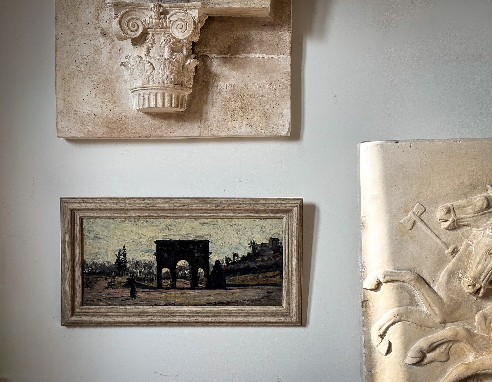 Executed with confident, expressive brushwork, the painting retains the immediacy of a plein-air study, the type of work produced by artists working directly from the ancient ruins during the final decades of the Grand Tour. The quick handling of the trees and sky, contrasted with the architectural mass of the arch, gives the composition a striking atmospheric presence.