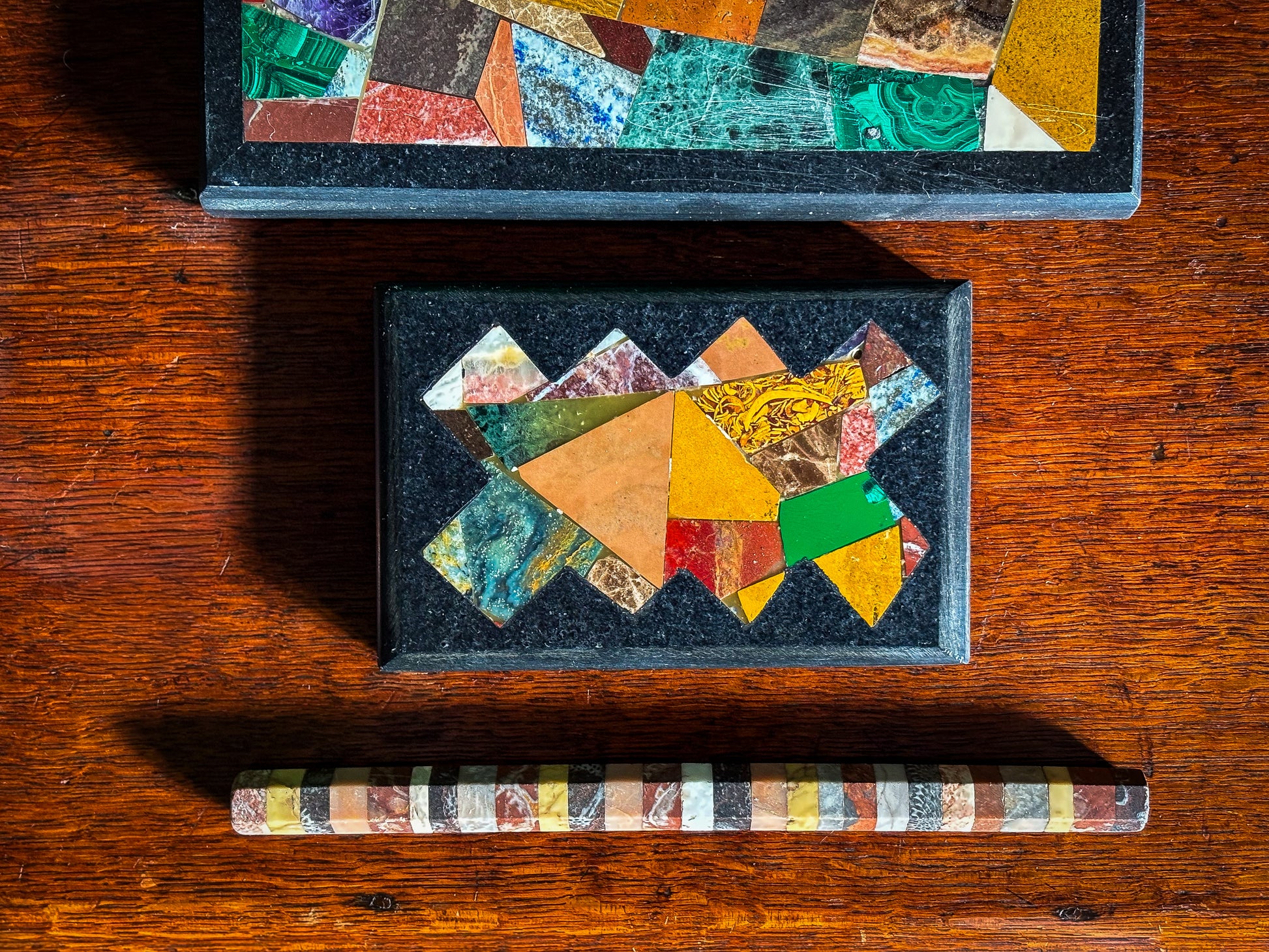 A Grand Tour specimen-stone paperweight, Italian, circa 1870, the rectangular black-stone body set with an abstract geometric mosaic composed of a notably diverse suite of hardstones, each finely hand-cut and inlaid.