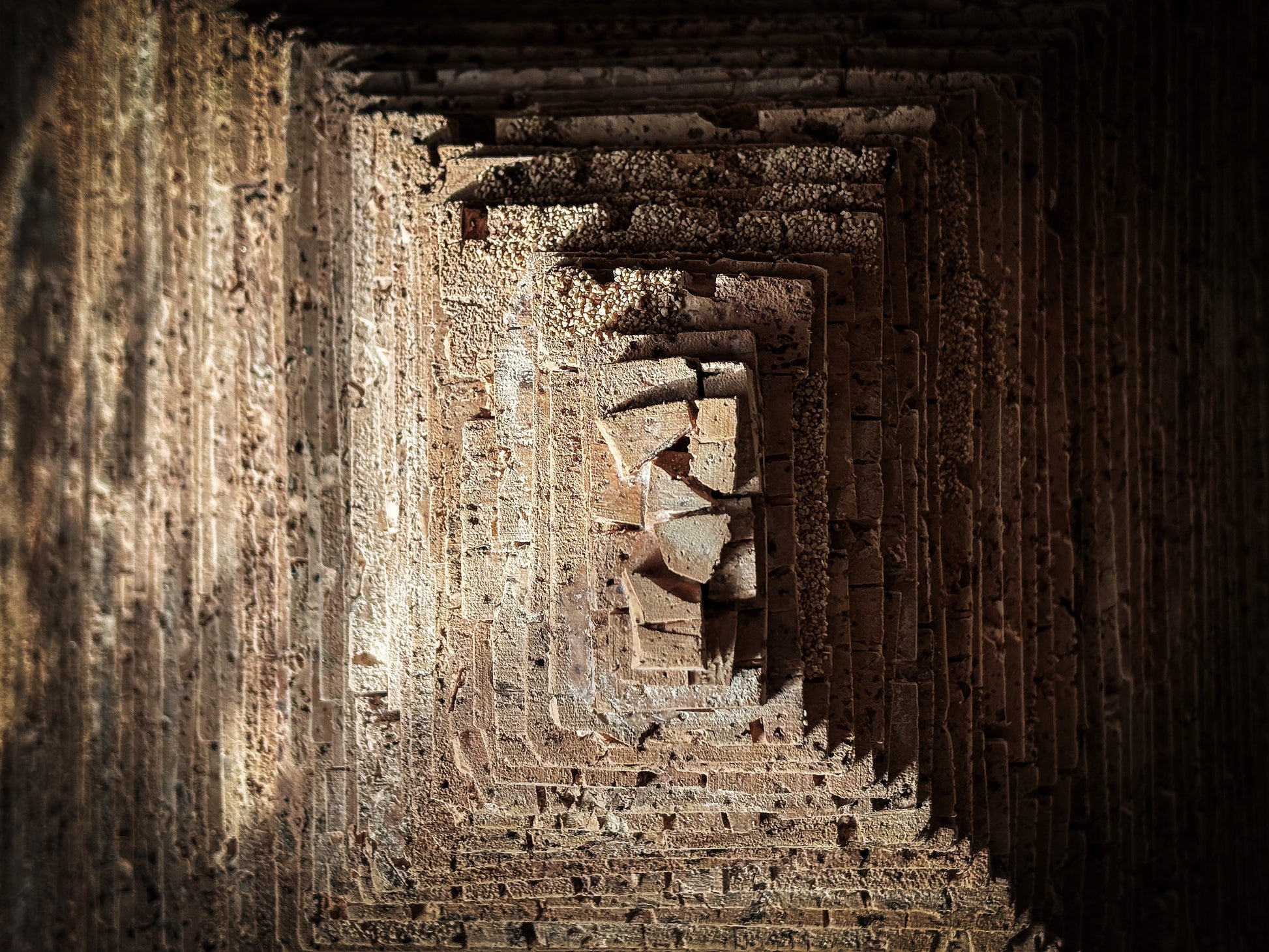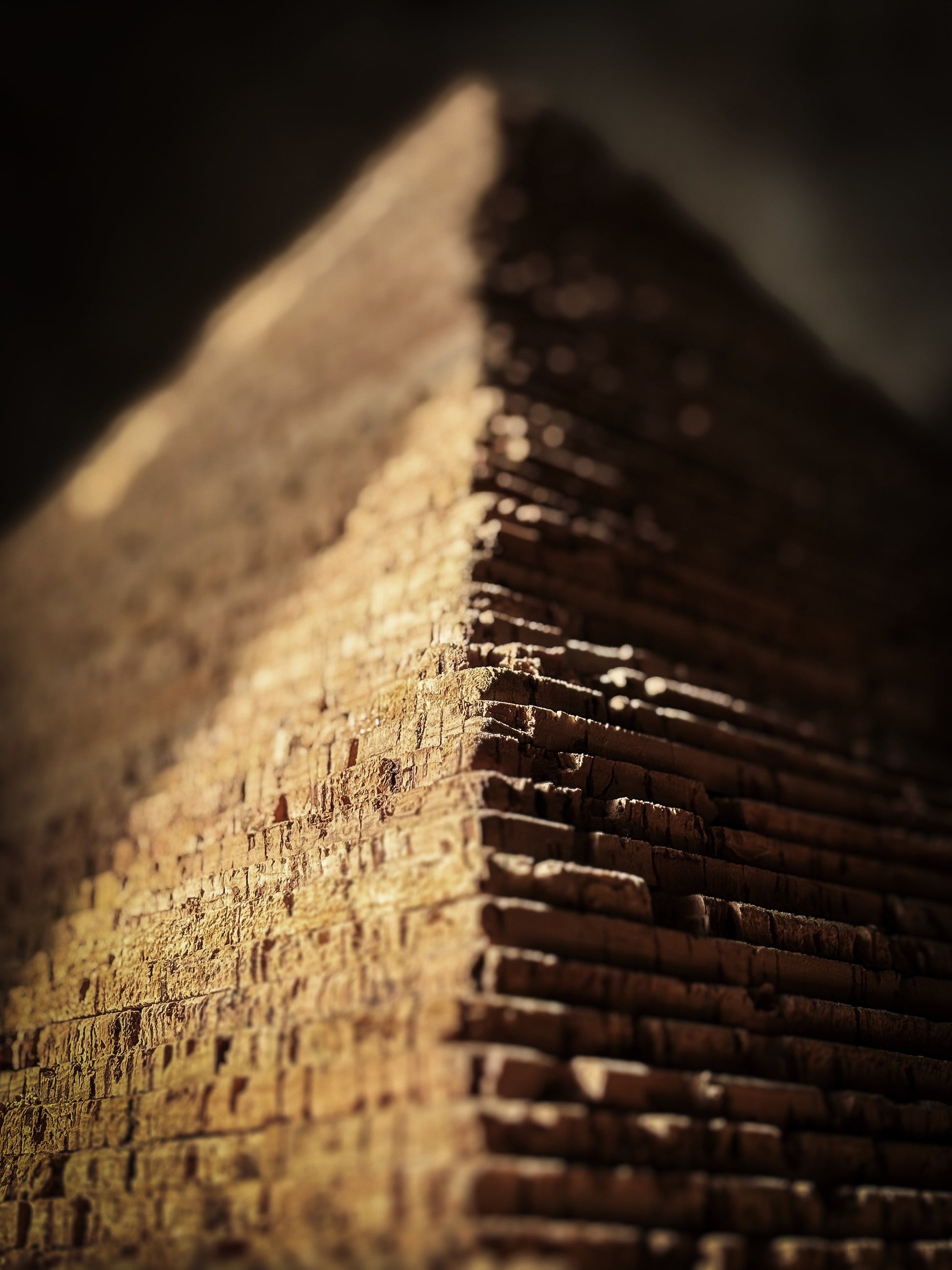 Here the layered cork construction reproduces the stepped courses of the pyramid’s exposed core masonry following the loss of its original casing stones. Deliberate areas of erosion, fractured blocks and surface irregularity evoke the immense antiquity of the monument and the dramatic weathering that characterises the structure today.