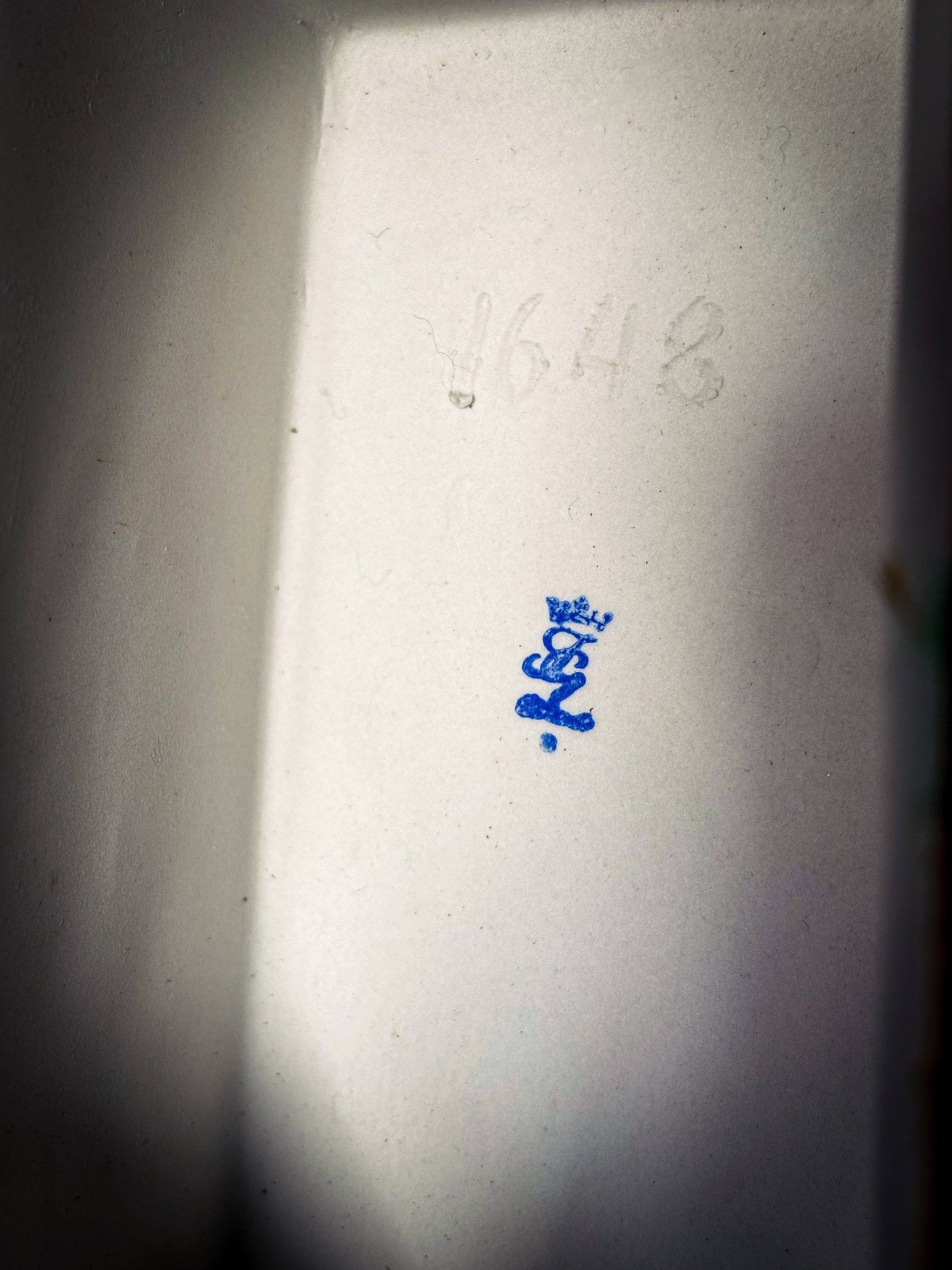 Unmarked apart from a blue crowned script cipher and mould number 1648 to the underside, a still-unidentified Continental factory, generally thought to be German and dating to the later 19th century, with comparable single examples recorded in the trade.